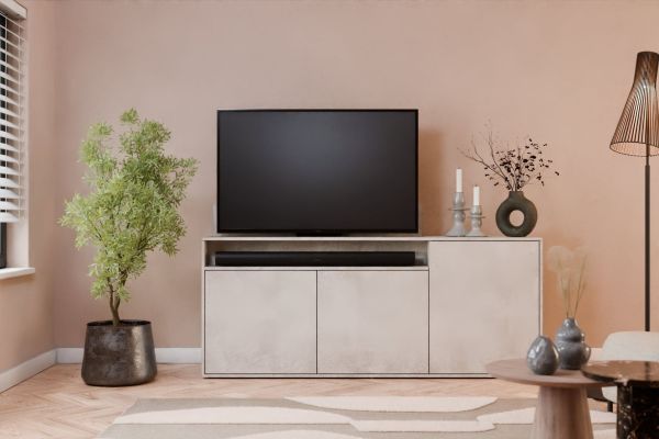 In your elegant living room, the TV can be completely concealed. The white sideboard with integrated soundbar and TV lift not only offers a minimalist look, but also extra space for accessories such as candles or decorative objects.
