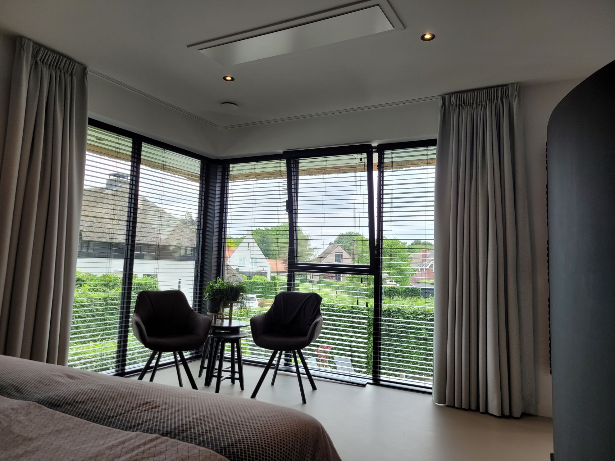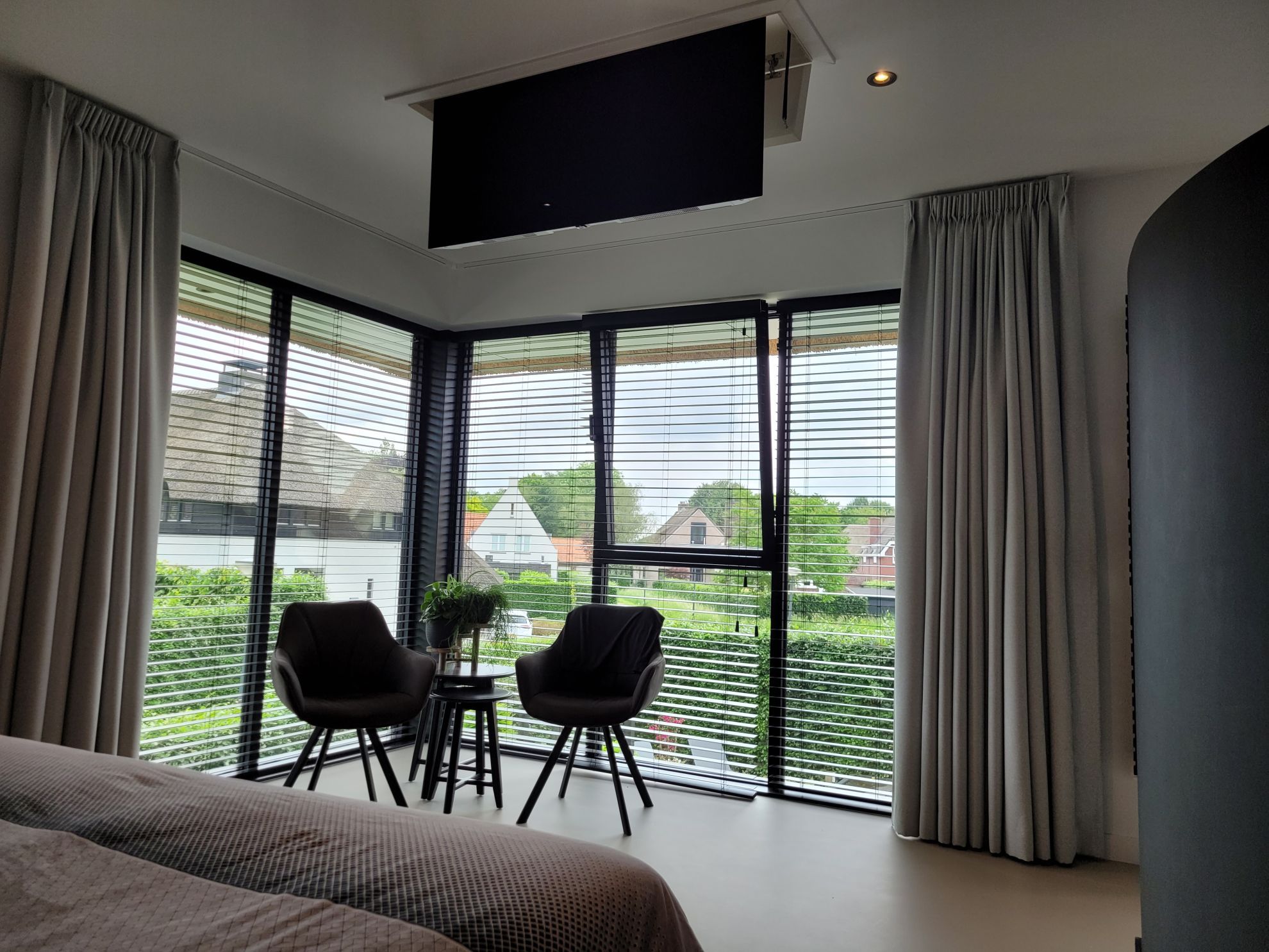 An inventive suspended construction, allowing the TV to exit the ceiling at an angle.