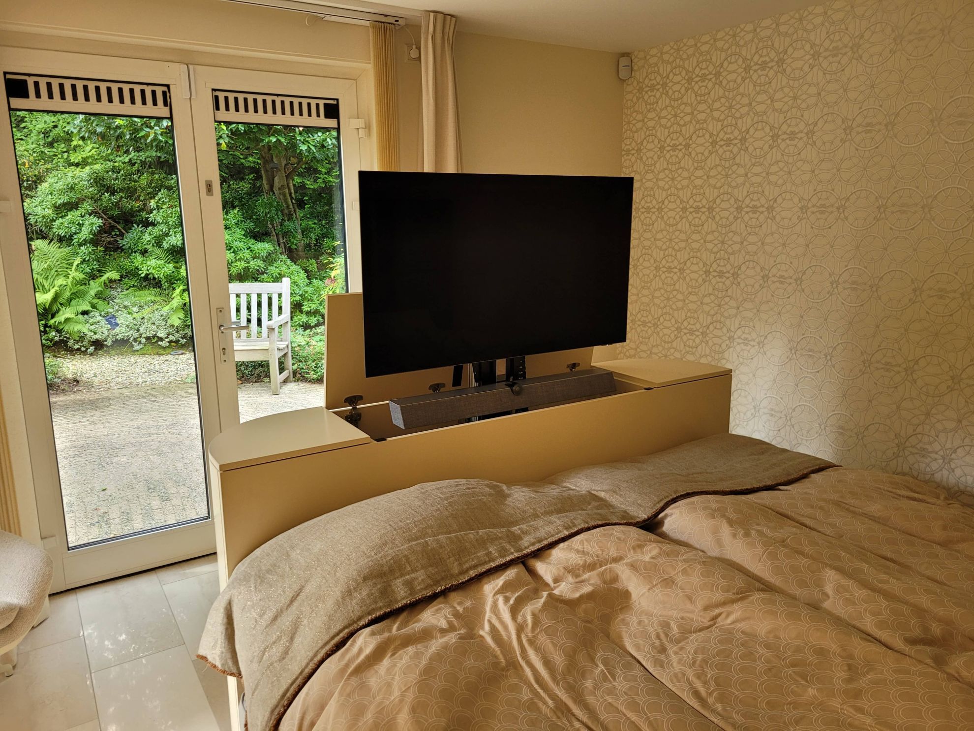 This custom-made footboard combines luxury and functionality. Equipped with a built-in 43-inch television, handy cabinets with drawers for extra storage space and an elegant rounded corner finish, it is a real eye-catcher in the bedroom.