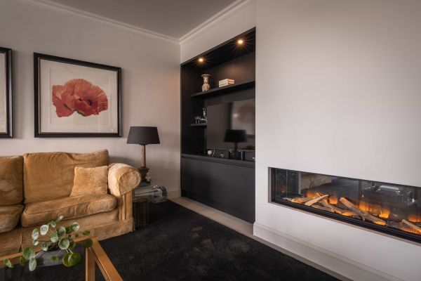 In uw stijlvolle woonkamer kan de TV worden weggewerkt waarbij het paneel verschuift en uw TV zichtbaar wordt. Uw TV kan eventueel naar voren komen en draaien. U creert rust in uw interieur en cinewall.